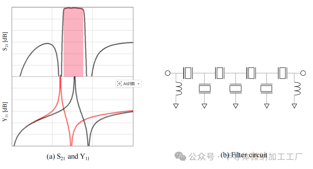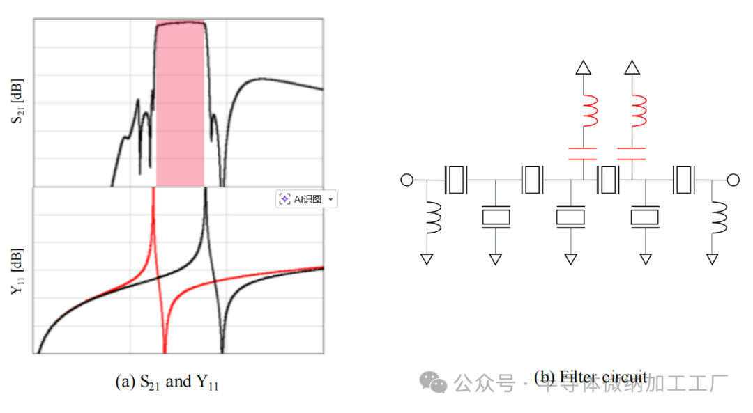 在经典的声波阶梯滤波器中,为了实现低损耗、平坦的通带和高衰减的阻带,组成阶梯滤波器的谐振器的分数带宽应大致为滤波器通带的二分之一,如图 13 所示[43,44]。然而,即使谐振器的分数带宽不足,仍然可以通过添加基于 LC 的补充组件(例如 LC 高通分支)来实现所需的滤波器带宽,如图 14 所示。XBAR 具有较宽的分数带宽,使得滤波器电路可以减少甚至消除外部组件,从而实现低损耗和高衰减的滤波器设计。