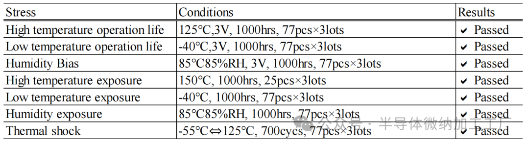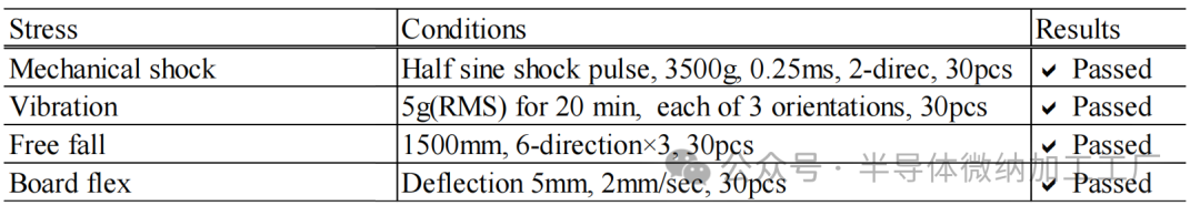 由于 XBAR 是作为一种新型声表面波(AW)器件开发的,因此目前尚无关于其工业稳定性特性的报道。无线通信滤波器根据不同的应用,通常会按照 JEDEC [48]、AEC-Q200 [49]、MIL-STD [50] 和 IEC 标准 [51] 进行可靠性评估。根据客户需求,它们还会接受额外的可靠性测试。在这里,我们描述了滤波器 #3 的各种可靠性测试结果。为了验证具有悬浮膜结构的 XBAR 滤波器在不同条件下的可靠性,进行了多种测试。表 II 显示了代表性的环境测试条件和结果。该产品通过了所有测试规格。其他机械测试(如表 III 所示)也已进行,并且所有测试规格都已成功通过。此外,还进行了耐久性测试,并确认符合要求。因此,尽管作为大规模生产产品的新开发 XBAR 器件的可靠性尚不明确,但我们现在知道 XBAR 滤波器能够通过各种必需的可靠性测试,并且其质量与现有的 SAW 和 BAW 滤波器相当。