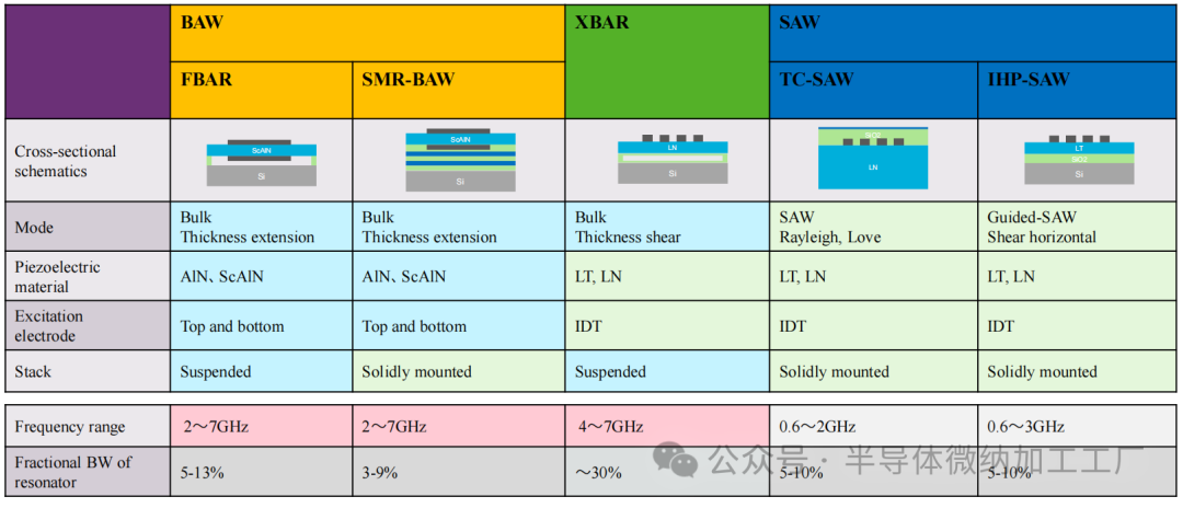 表I展示了在大规模生产中的声波设备的比较,用于无线通信设备。XBAR可以被归类为一种新的混合设备,结合了BAW设备(如FBAR和SMR-BAW)和SAW设备(如TC-SAW和IHP-SAW)的特性。此外,作为XBAR的一项独特结构特征,IDT的金属化比约为0.2,这比传统的SAW和Lamb波谐振器的金属化比(约为0.5)要窄。这意味着谐振器的IDT电极部分的面积较窄,电极之间的间隙区域较宽,而XBAR模式的激发声能有效地被限制在电极之间的薄片中,从而实现高耦合和Q值。