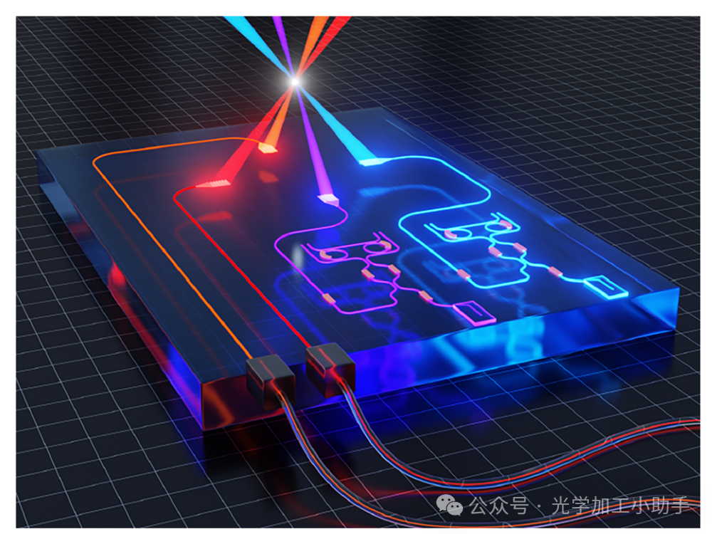 展望将芯片扩展腔二极管激光器直接嵌入到通用集成离子阱的光子束传输中。使用氧化铝(Al₂O₃)作为波导平台可以实现从红外到紫外的多波长生成和操作。另一种选择是通过光纤将用于探测离子的光引入芯片。为了更清晰,图中省略了离子阱电极和光调制元件