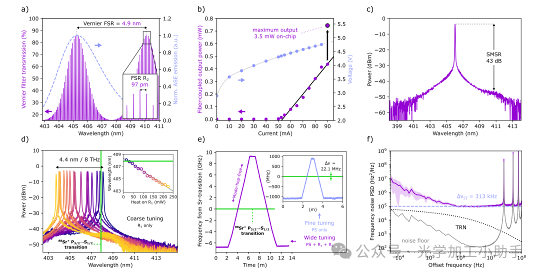 粗调允许在激光的宽光谱范围内快速而完整地访问波长,但这是通过激光模式跳跃来实现的。相比之下,实现平滑、无间隙的调谐到预定的、固定的光频率是将激光锁定到被困离子的窄原子跃迁中的关键。图2e展示了激光在连续的16 GHz宽范围内的无模式跳跃调谐,其中包括88Sr+离子P3/2 → S1/2跃迁的光频率734.99068 THz(≈ 408 nm),通过校准的高分辨率波长计测量得到。宽范围的无模式跳跃调谐是通过以固定的5.2:1:1加热功率比串联调整相位部分和两个环形谐振腔加热器来实现的,而更精细的高分辨率调谐可以通过仅调节相位部分加热器来轻松实现(见插图)。单独的实验显示,这种三加热器调谐方案在其他波长下支持最多21.5 GHz的无模式跳跃调谐,激光可以在超过70分钟的记录中几乎保持在Sr跃迁线宽内(见补充信息)。