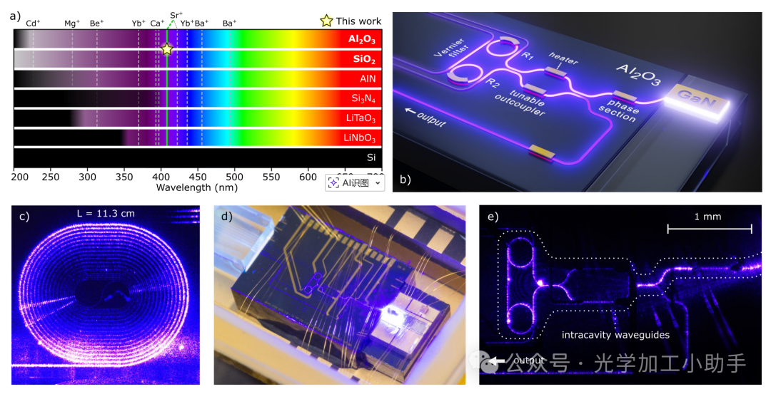 与氮化硅不同,使用氧化铝(Al₂O₃)作为核心材料,硅二氧化物(SiO₂)作为包层材料来构建集成波导平台,将是一个非常适合被困离子所需的全波长范围的候选材料。图1a展示了各种相关材料的透明度范围概况,可以看出氧化铝的透明度范围非常广泛,甚至涵盖了深紫外(UV)范围,这归因于其近7.6 eV(或165 nm)的宽禁带【14,15】,而硅二氧化物则具有更宽的禁带,达到9.3 eV(或133 nm)【16】。迄今为止,在紫罗兰和紫外范围(360至405 nm)内,已经报道了传播损耗低于3 dB/cm的氧化铝波导,以及质量因子高达150万的微环谐振腔【14,17,18】。与氮化铝(AlN)波导在379 nm时的传播损耗60.4 dB/cm【19】相比,最近的测量显示,氧化铝在相同波长下的薄膜损耗为0.4 dB/cm,波导传播损耗为1.3 dB/cm【20】。如此低的损耗值表明,氧化铝集成电路可以将光的传输扩展到紫外深处,同时通过调制器调节光的方式可以依赖于压电光机电实现【21】或平台独立的技术【22,23】。