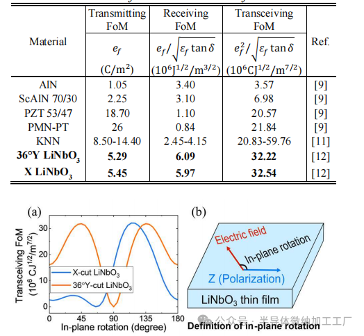 表1比较了不同材料在其最佳工作模式下的性能,考虑到LiNbO₃在横向场激励(LFE)下工作更高效,而其他列出的材料则在厚度场激励(TFE)下工作更高效。图1(a)展示了X切和36°Y切LiNbO₃的传输接收FoM与平面旋转角度的关系,定义为电场相对于材料极化(Z轴)的角度[图1(b)]。如图所示,X切LiNbO₃的最大FoM出现在平面旋转角度为120°时。