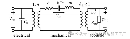 图4:包括电气、机械和声学域的PMUT等效电路模型。