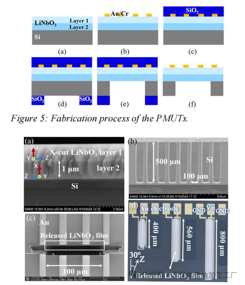 通过扫描电子显微镜(SEM)观察的晶片堆叠的横截面形貌(图6(a))清晰地揭示了两层LiNbO₃之间的界面。使用标准硅样品优化了DRIE工艺,成功地获得了满意的垂直轮廓[图6(b)]。制造的PMUT器件如图6(d)所示,展示了顶电极与背面刻蚀区域之间的精确对准。为了检查悬挂LiNbO₃薄膜的横截面,进行了聚焦离子束(FIB)铣削。所得的SEM图像[图6(c)]确认了释放膜的均匀厚度,并且没有残留的硅物质在下方。