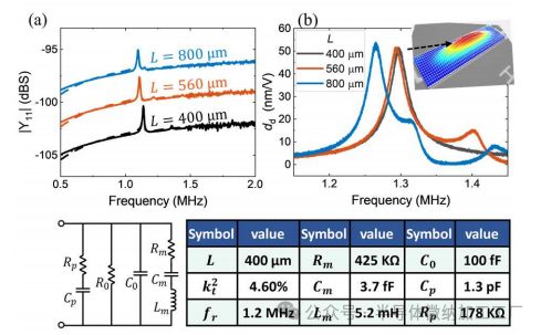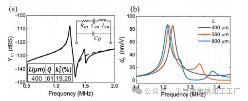 进行了有限元分析(FEA)以模拟电气导纳(Y₁₁)和动态位移灵敏度($%)。对于不同长度的器件,在约1.2 MHz时获得了明显的弯曲模式,表明共振频率主要受腔体宽度的支配。模拟的Y₁₁导纳参数如图3(a)所示,并进行了巴特沃斯-范·代克(BVD)模型拟合。提取的电机械耦合度 κ2\kappa^2κ2(定义为 π⋅d3328⋅ϵrtanδ\pi \cdot \frac{d_{33}^2}{8 \cdot \epsilon_r \tan \delta}π⋅8⋅ϵrtanδd332)为19.25%,对于长度为400 μm的器件,值得注意的是,这一电机械耦合度比之前单层36°Y切LiNbO₃基PMUT的演示高出4倍以上[14],并且比最佳的ScAlN基PMUT高出10倍[15]。