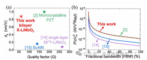 图8(a)比较了测得的静态位移灵敏度(Δxs\Delta x_sΔxs)与其他材料的已报告值。如图所示,测得的 Δxs\Delta x_sΔxs 是报告的基于ScAlN的PMUT(0.16 nm/V)[15]的5倍,且接近单晶PZT基PMUT(1 nm/V)[2]。在实际应用中,PMUT的带宽应根据不同应用的需求进行调整。考虑到辐射声功率和分数带宽(Q=1/4Q = 1/4Q=1/4)之间固有的权衡,图8(b)展示了基于归一化声功率(G/FRaylG/F_{\text{Rayl}}G/FRayl)的PMUT比较,如公式(1)所定义。这些曲线是根据已报告的共振频率、质量因子、位移灵敏度和面积计算得出的。在这个比较中,我们假设所有器件的有效面积 AradA_{\text{rad}}Arad 为悬挂区域的1/3。具体来说,在 Q=100%Q = 100\%Q=100% 时,我们的器件(长度为800 μm)的归一化声功率为 1.32×10−3W/VRayl1.32 \times 10^{-3} \, \text{W/V} \, \text{Rayl}1.32×10−3W/VRayl,这比ScAlN基PMUT高出近7倍,且与单晶PZT基PMUT相当[2]。