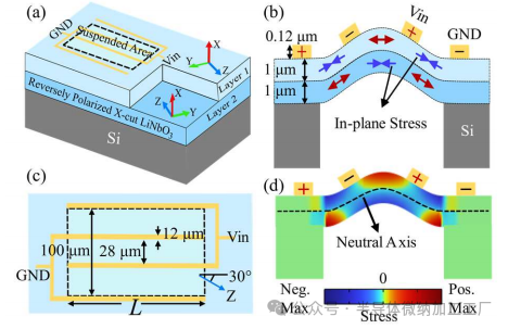 通过将信号(VVV)施加到互指电极上,横向电场在每个LiNbO₃层内诱导交变的横向平面应力,从而激发结构的弯曲变形。反向的Z轴方向使得在相同电场作用下,两个LiNbO₃层产生具有相反符号的平面应力[图2(b)]。这种配置充分利用了与结构弯曲相关的平面应力[图2(d)],从而提高了换能效率。两层LiNbO₃的厚度设计为相同,确保了板的中性轴位于接口处。