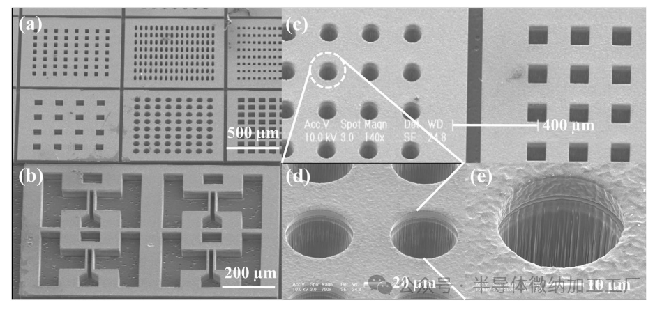 原子力显微镜(AFM)图像如图1(d)所示,展示了在使用不同气体比例的气体混合物刻蚀后的表面粗糙度。可以观察到,随着SF6在SF6+O2气体混合物中的比例增加,表面粗糙度变得不那么平滑。随着SF6比例的增加,表面粗糙度从6.7nm逐渐恶化到11.3nm至14.0nm,随后在SF6流量为25 sccm时突然反弹至22.1nm。表面粗糙度的恶化主要是由于低挥发性的反应产物,如CFx(CF2,CF3)被生成,并作为次级掩膜散布在刻蚀表面。通常,当更多氟离子参与反应时,会生成更多的产物,导致刻蚀表面变得更加粗糙。此外,当气体比例超过80%时,粗糙度恶化尤为严重,这是因为氟原子成为主要的反应物,它们作为主要的化学反应物起作用。自由表面比例迅速增加,为物理溅射刻蚀和化学反应提供了有利条件。为了实现3050Å/min的刻蚀速率,使用ICP干法刻蚀的优化参数为:线圈功率=2000 W,工作台功率=200W,工艺气体混合物=SF6(20 sccm)+O2(5 sccm),工艺压力=20 mTorr。图2展示了在本研究中形成的70µm通孔阵列的扫描电子显微镜(SEM)图像。