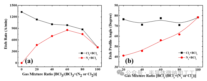 (b) BCl3+N2气体混合物(红线)实现了40°到80°之间可控的刻蚀轮廓角度,随着混合比例的变化几乎呈线性变化。相比之下,BCl3+Cl2气体混合物(黑线)表现出不稳定的特性。