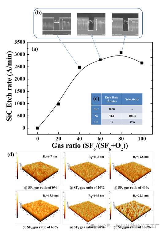 图1(b)展示了基于SF6气体比例为40%、60%和80%刻蚀的SiC横截面图像,图中清晰显示了垂直刻蚀结构。这验证了我们所提出实验的成功,并展示了在所有刻蚀条件下观察到的差异,这些差异依赖于我们提出的工作。