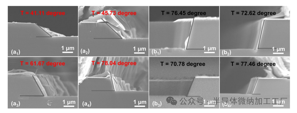 (b4) 仅使用BCl3气体(100%)导致最大刻蚀角度77.46°。小角度斜面刻蚀