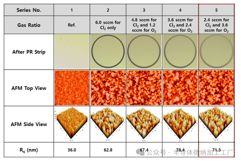 图6. 使用原子力显微镜数据研究不同Cl2和O2比例的表面形态学影响。结果表明,在使用适当的气体混合比例时,得到的表面粗糙度对于APD应用是可接受的。