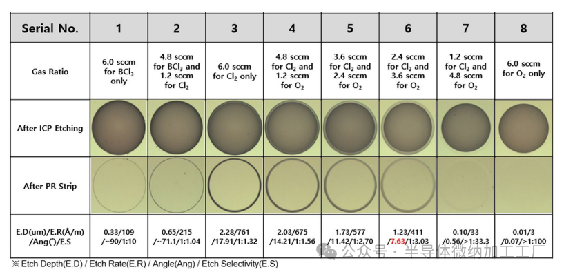 图5. 不同BCl3、BCl3+Cl2、Cl2和Cl2+O2气体比例下的ICP刻蚀轮廓。如图所示,使用Cl2气体(2.4 sccm)与O2气体(3.6 sccm)组合,可以实现较高的刻蚀深度(1.23µm)和较低的刻蚀轮廓角度(最小7.63°),刻蚀速率为411Å/min,选择性为1:3.03;固定刻蚀时间为30分钟。
