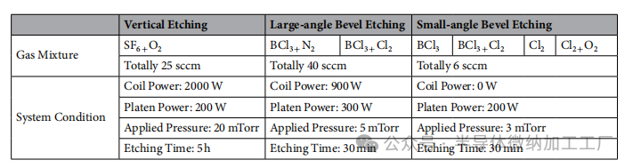 本研究还开发了一种有效的大角度斜面结构刻蚀形成工艺,采用BCl3+N2和BCl3+Cl2气体混合物。研究了使用BCl3的不同比例(从0%到100%)的SiC刻蚀条件,使用了固定的工艺条件(线圈功率=900W,工作台功率=300W,工艺压力=5 mTorr,刻蚀时间=30分钟)进行ICP干法刻蚀过程,分别使用BCl3+N2和BCl3+Cl2气体混合物。此外,还研究了包括BCl3、BCl3+Cl2、Cl2和Cl2+O2在内的不同气体混合物,以获得小角度斜面结构。共进行了六个不同的测试,包括单独使用6 sccm的BCl3、4.8 sccm BCl3+1.2 sccm Cl2的BCl3+Cl2混合物、单独使用6 sccm的Cl2、以及3种Cl2+O2气体混合物,分别为4.8 sccm Cl2+1.2 sccm O2、3.6 sccm Cl2+2.4 sccm O2和2.4 sccm Cl2+3.6 sccm O2。该实验的详细总结见表1。