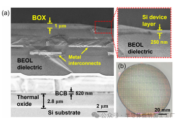 图2.(a) 绑定和薄化晶圆的横截面SEM图像,显示底部的氧化硅(Si)基板,以及顶部来自SOI CMOS工厂晶圆的转移层,包含金属互连。插图突出了SOI CMOS基板的硅器件层。