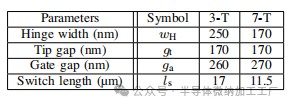 (b) 7-T NEM开关的SEM图像,均为释放刻蚀之前(图1a(v))。