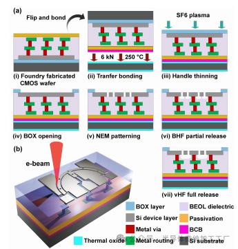 纳米机电(NEM)开关具有独特的优点,包括近乎垂直的开关斜率和零关态泄漏电流[1],[2],使其成为CMOS电路在特定应用(如边缘计算)中的高效能替代品[3]–[5]。NEM开关的应用已经在CMOS电源门控[6],[7]、现场可编程门阵列(FPGAs)[5],[8],[9]、能效查找表(LUTs)[10]–[12]以及存储器件[13]–[15]中得到探索,所有这些应用都得益于减少静态功耗。然而,将NEM开关电路扩展到标准CMOS工厂的制造并在实际系统中实现密集互连,仍然面临着挑战,这限制了其工业应用[3],[16],[17]。先前的研究探索了利用CMOS后端线路(BEOL)中的三维金属互连层,如铝[3]和铜[14],[15],[18]–[20],作为NEM开关的结构材料和布线路径。有关集成NEM开关的详细比较,请参见我们的近期工作[21]。然而,这种方法面临材料疲劳、金属结构卷曲、残余应力梯度和热预算限制等可靠性问题[22]。此外,开关设计通常限制为直立悬臂梁结构,因为像曲线结构这样的更多功能性几何形状很难在BEOL限制下实现。相反,单晶硅(Si)NEM开关由于硅的优异材料质量[23]–[25],提供了更好的长期稳定性,并通过平面光刻图形化提供了更大的设计灵活性[26]。然而,目前大多数Si NEM开关都是在SOI基板上制造的,并且没有多层互连,限制了布线仅限于单层(如Si器件层),并阻碍了复杂逻辑电路的实现[17],[23]。我们最近报告了在SOI工厂工艺中单片集成Si NEM开关和BEOL互连[17],[21]。然而,这种方法在可实现的NEM开关集成密度和布线灵活性方面存在严重限制,因为开关不能与互连垂直堆叠。三维集成通过垂直堆叠互连层和NEM开关来增强布线密度,具有实现大规模Si NEM电路的巨大潜力[5],但这一点尚未实现。在这里,我们介绍了一种三维异质集成方法,该方法利用现有的SOI CMOS工艺(如图1a所示)。通过这种方法,我们展示了集成的三端(3-T)和七端(7-T)NEM开关,具有易失性和非易失性功能。这种架构使得Si NEM开关可以垂直堆叠在BEOL互连上,增强了布线密度和器件数量,从而为构建高密度NEM逻辑电路和非易失性存储器打开了新的方向。