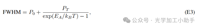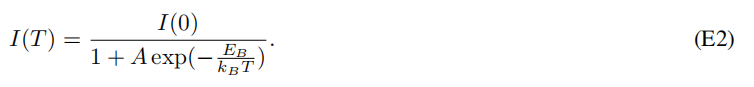 (d) 使用方程E3拟合的半最大全宽(FWHM)。这些样品在多次冷却过程中进行了测量。对于每次冷却,退火温度为465°C的样品被用作参考,以确保在不同冷却周期之间进行一致的PL强度比较。在第一次冷却周期中,记录的465°C样品的TX0峰被确定为“主”参考,记为Cmaster(1326 nm)。为了补偿不同冷却周期之间激发/收集效率的变化,所有其他光谱都归一化为同一冷却周期中参考样品的比率,即Cref(1326 nm)。因此,原始亮度Craw(λ)被转换为归一化亮度Cnorm(λ)。我们扫描了制冷机和样品的温度,从4.8 K到90 K,结果如图E9(a)所示。随着温度的升高,硅的带隙发生红移,这是由于晶格中声子相互作用的增强,这反过来使T中心的发射发生红移(见图E9(b))。一种能够很好地描述硅带隙温度依赖性的模型是玻色-爱因斯坦模型[52]。其中,α\alphaα 是一个耦合常数,用于描述与声子相互作用的强度,Θ\ThetaΘ 是一个材料依赖的有效声子温度。发射体的亮度在较高温度下下降,这可以归因于激发载流子占据了会非辐射衰减的态的概率增加,从而无法贡献于发射信号。最简单的模型,假设只有一个非辐射衰减通道,可以表示为:其中,EBE_BEB 是辐射衰减通道的能量。对提取的PL信号的拟合见图E9(c)。在较高温度下,该模型失效,并且对于TX0和TX1线的亮度都有过拟合,认为这是由于多个非辐射衰减通道变得显著[53, 54]。最后,随着温度升高,线宽增加。我们使用一个简单的模型来描述热激活的均匀展宽[55],该模型由以下公式给出:其中,EAE_AEA 是展宽变得显著的能量。在图E9(d)中可以看到拟合结果,其中我们得到TX0线的过渡能量为 EA=16(14,18)E_A = 16(14, 18)EA=16(14,18) meV,TX1线的过渡能量为 EA=19(16,23)E_A = 19(16, 23)EA=19(16,23) meV。该模型表明,展宽是由于声子环境激发了更高阶的电子态,这些电子态与TX0和TX1线的能量差为 EAE_AEA,因为这些态允许通过不同的通道发生衰减。表F3展示了硅中颜色中心的广泛发射线列表,包括它们的中心波长、能量、一般结构和自旋特性。它还包括与之相关的线,如声子的横向声学(TA)和横向光学(TO)线以及局部振动模式(LVM)。我们还在我们的PL光谱中展示了4个稳定的信号,这些信号尚未得到解释,见图F10。面板 (a-d) 对应于表F3中列为“Unknown1-4”的线。Unknown1的特征形状和非常宽的半峰宽度(FWHM)可能表明它与其他峰值具有不同的发射过程,并且可能是一个更宽的发射过程,而其他峰值的形状更接近于来自其他颜色中心的发射线。为了便于可视化,已从信号中去除了特征化的光致发光背景。先前的研究[47]表明,在激活退火过程中氢的部分压力可能对生成高产率的T中心至关重要,尤其是在氢过饱和和欠饱和的情况下。特别地,将样品在去离子水中煮沸被提出作为提高T中心生成效率的方法[23]。为了研究我们的T中心生成过程是否可以进一步优化,以及是否可以解释我们发现的最佳退火温度与现有文献中差异,我们将两个样品在去离子水中煮沸了1小时,然后在465°C和525°C下进行退火。以下PL测量的结果如图G11a所示,结果表明煮沸对T中心的密度没有显著影响。在用于退火主文中所示样品的炉子中,温度是通过附加在包含芯片的加热器上的热电偶进行测量的。通过5000 sccm的高流量氮气通过炉子,确保了纯氮气氛,但这可能导致样品局部冷却,从而导致我们高估了样品的实际温度。为了研究这一点,5个样品在另一台RTP工具(Jipelec JetFirst 200 RTP)中退火,该工具配有真空腔和涡轮泵,使我们能够在不受环境空气污染的情况下以较低的工艺气体流量(200 sccm)运行该过程。该工具中的温度是通过光学高温计测量的,样品被放置在一个没有盖子的加热器上,位于载片上,尽管这种方法准确性较低,但不像热电偶那样容易受到系统性偏差的影响。我们在Jipelec工具上运行的结果如图G11b所示,我们看到最佳退火温度略高,这与我们的主要RTP工具中的热电偶放置在最远离热源的加热器底部一致,这可能导致使用热电偶测量时实际样品温度的轻微低估。我们还研究了2000 sccm的较低气体流量是否会导致样品冷却减少,从而使得热电偶测量的最佳退火温度较低,但我们的结果与之前的实验一致,如图G12所示。图G11.a): 展示了我们在激活退火前立即在去离子水中煮沸1小时的样品结果,显示最佳退火温度没有明显变化,也没有与对照样品显著偏离。