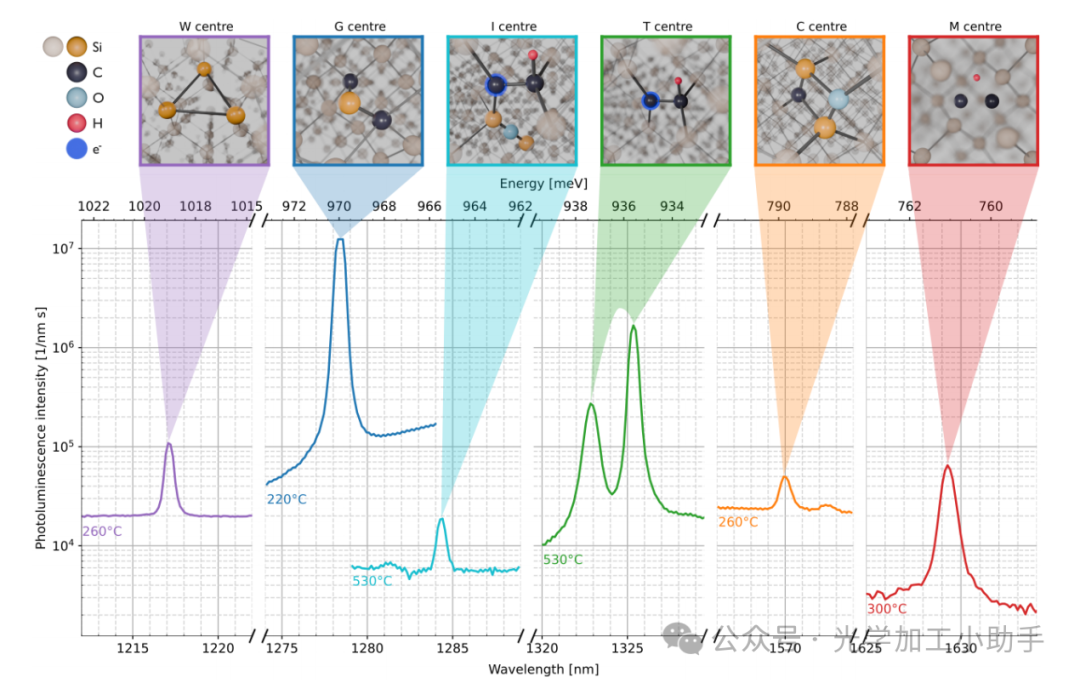 图1. 显示在不同退火温度下,1200到1600 nm范围内显著色心的特征光致发光(PL)光谱。这些峰值对应的缺陷的原子结构也在插图中展示[10],但M中心的原子结构尚未确定。对于每个缺陷,我们展示了在我们测试的不同退火参数下获得的最高光致发光信号的PL光谱。与每个峰值相关的退火温度在每个峰值下方给出。