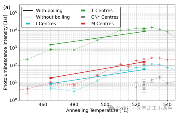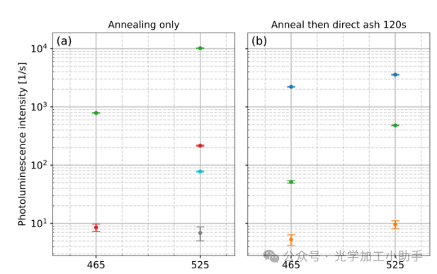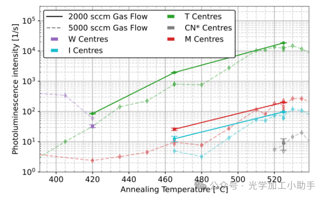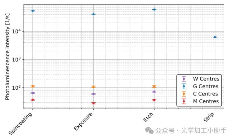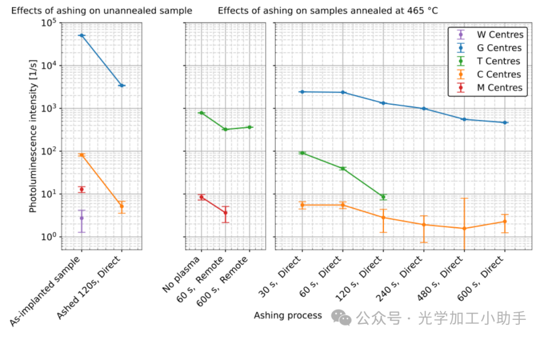 进一步的实验,包括改变退火和纳米制造过程的顺序,发现灰化过程的影响与仅加热样品的效果显著不同,因为灰化过程还会重新引入先前在样品中退火出去的T中心和C中心。图5显示了不同清洗程序下的峰值强度,样品在465°C或525°C退火,显示了T中心发光的减少以及G中心的再激活,这可能是由于光学不活跃缺陷的分解所导致。所使用的灰化工具(Tergeo Plasma Cleaner)支持直接和远程等离子体源,这意味着等离子体可以分别在主室中与样品一起生成,或在次级远程室中生成并间接引入样品。
