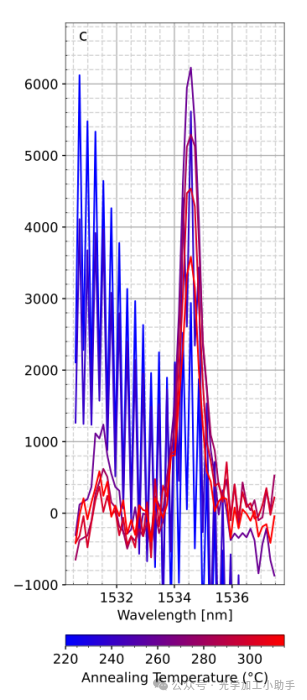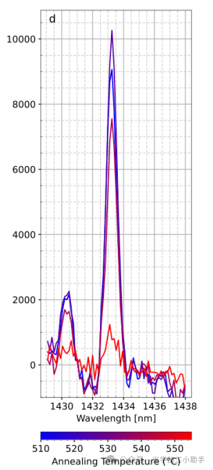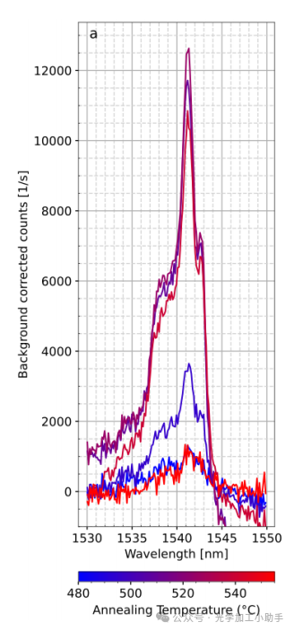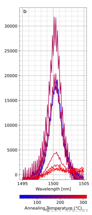 在最终退火步骤之前完成整个光子集成电路(PIC)制造过程,证明能够获得与未暴露于PIC制造的样品相似的T中心密度。因此,我们建议采用这种制造步骤顺序。进一步的纳米制造步骤,如果必须应用于材料堆叠(例如量子计算),不应将样品加热至超过约400°C的高温并持续较长时间,以避免如图2所示的影响T中心密度。此外,我们还展示了高强度等离子体清洗会降低T中心的密度,但这一影响可以通过将最终退火步骤延迟至灰化之后来避免,如图5c所示,或通过使用温和的远程灰化来避免,如图5d所示。远程灰化可能在颜色中心作为生长时存在于基底中并且需要在不进行退火步骤的情况下保留的情况下,尤其有用,例如在文献[48]中所述的情况。
