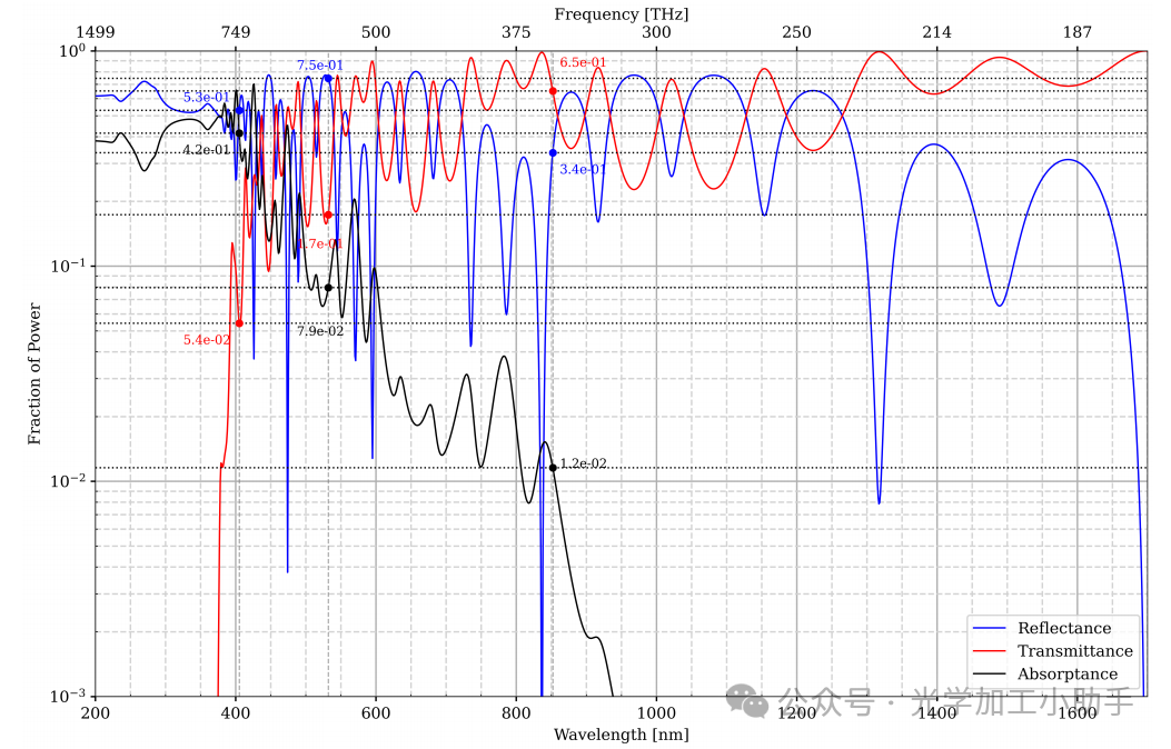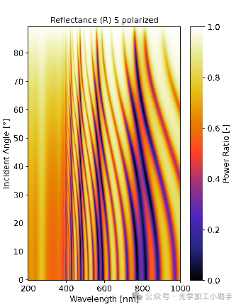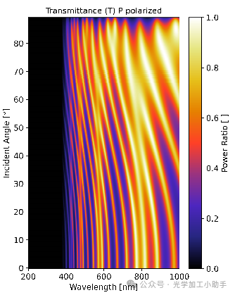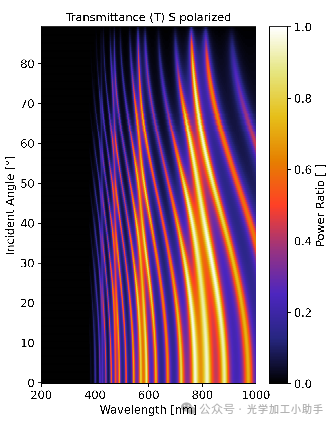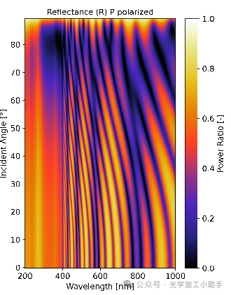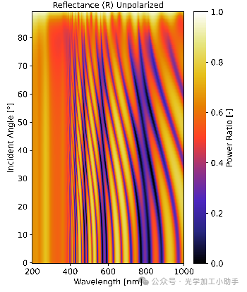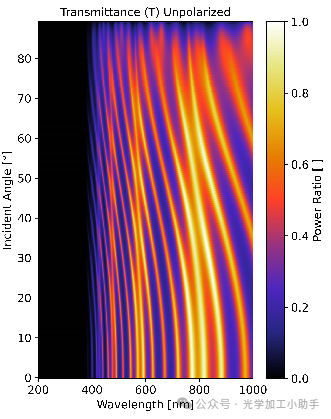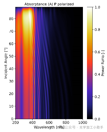该图展示了不同条件下SOI堆叠顶层的光学特性(吸收、透射和反射),通过传输矩阵方法(TMM)进行仿真,涵盖了不同波长、入射角和偏振状态的影响。该仿真为理解光与SOI结构的相互作用提供了全面的数据,特别是在不同条件下的能量沉积和材料响应。