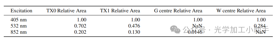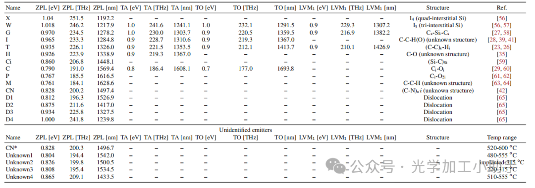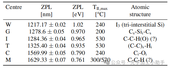 表I. 已识别的颜色中心及其对应的零声子线(ZPL)能量和波长。TII,max表示观察到最大积分PL强度的退火温度。标记为“(?)”的条目对应于原子结构未知或推测的缺陷。报告的误差为±1σ统计不确定度。