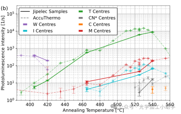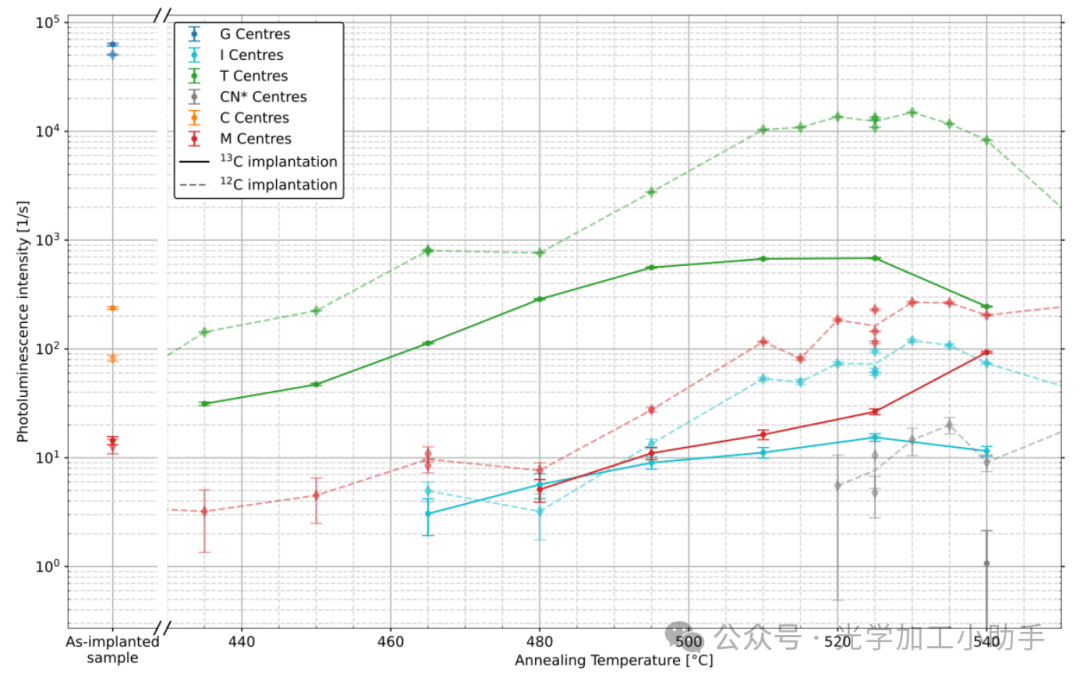 所有在未退火植入样品中观察到的基于碳的缺陷在约400°C时达到其最低相对发射强度,留下一个大致在360°C到420°C之间的温度窗口,在该窗口内光学活性几乎可以忽略不计。这一行为表明,在此温度范围内,碳——主要以高度可移动的Ci形式——开始与其他离子形成复合物,产生光学不活跃的碳相关缺陷,并减少G、C和M中心的数量。这个在360°C到420°C之间稳定的中间碳相关暗复合物,可能充当促进后续T中心形成的前体。另一方面,与其他基于碳的中心不同,M中心仅在360°C到435°C之间的温度区间内未被观察到,这表明负责M中心形成的前体复合物在低温处理前以及在这个中间温度范围内保持稳定。