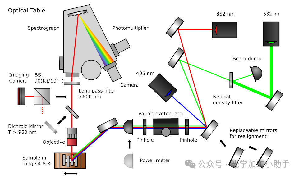 使用了三种不同波长的激光:405 nm、532 nm 和 852 nm。初步对准使用了两个针孔。可更换的带磁脚的镜子被用来方便且可靠地对准三种激光。一个可调衰减器和功率计用于控制光束的功率。最后的镜子将光束引导到制冷机(cryostat),以约30°的入射角射入制冷机窗口和样品。制冷机在4.8 K下操作。使用了10倍放大物镜收集PL信号,信号通过一个长通滤光片(>800 nm)以过滤掉激光光线。对于852 nm激光,插入了一个二色镜(T>950 nm)来移除收集路径中的激光。通过插入一个(90 R,10 T)光束分离器获得样品的图像。最后,信号进入光谱仪,并使用透镜优化以解析来自样品的不同颜色中心信号。