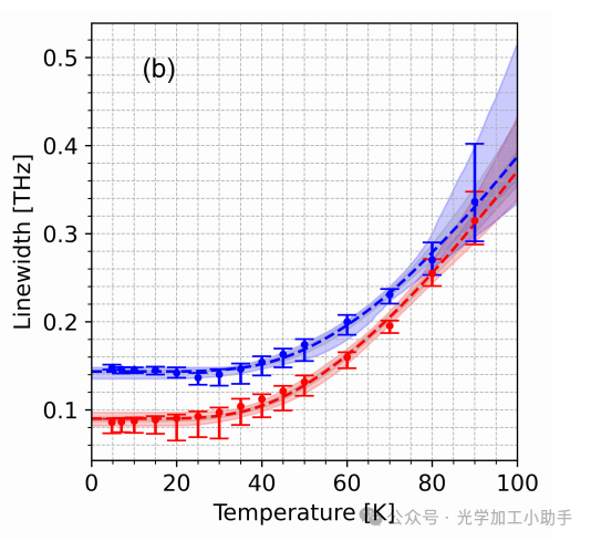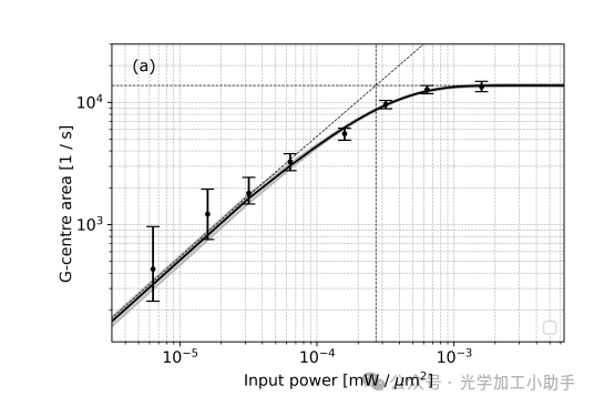 (a) G中心的PL发射在8.5 mW(范围为7.8 mW到9.3 mW)时饱和,饱和亮度为2.8 × 10⁶(范围为2.7 × 10⁶到3.2 × 10⁶),饱和功率为2.7 × 10⁻⁴ mW/µm²(范围为2.5 × 10⁻⁴到3.0 × 10⁻⁴ mW/µm²),模型阶数为0.969(范围为0.911到0.995),接近于单位值,符合一阶过程的预期。