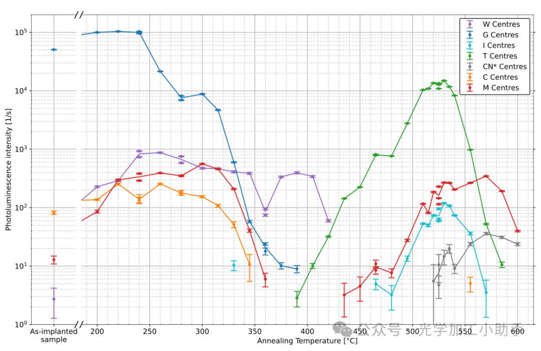 在图2中,我们还观察到G中心在约400°C时消失,这正是T、M和I中心出现的温度,表明它们的(去)形成动态是相互关联的。到了600°C,高温似乎导致所有缺陷之间的键断裂,所有跟踪的颜色中心的光学信号显著减弱或已经无法检测到。