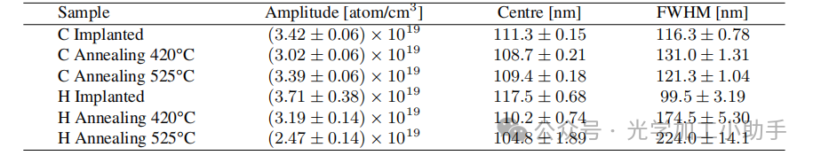 表B1. SIMS数据的高斯拟合参数,符合模型 A exp(−(x−x₀)²/(2σ²))