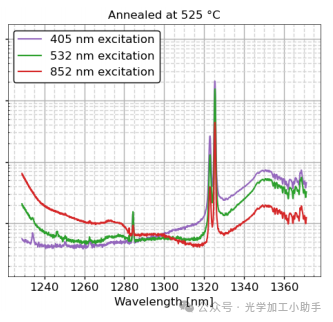 左侧图是来自未进行植入的样品的光谱,中央图是退火温度为465°C的样品,右侧图是退火温度为525°C的样品。可以明显看到一个趋势:较低波长的激光激发使得中心颜色中心的发射光谱更亮,而材料响应则表现出较少的规律性。