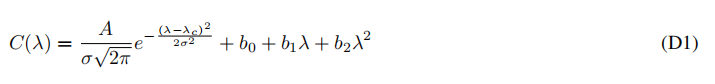 为了确定PL光谱中W、G、C、I和M中心的中心频率、幅度、宽度和峰面积,我们将这些中心的峰值拟合为高斯函数与二次“背景”的和,背景描述了来自带上激发的SOI材料响应。因此,计数 CCC 作为波长 λ\lambdaλ 的函数,可以表示为: