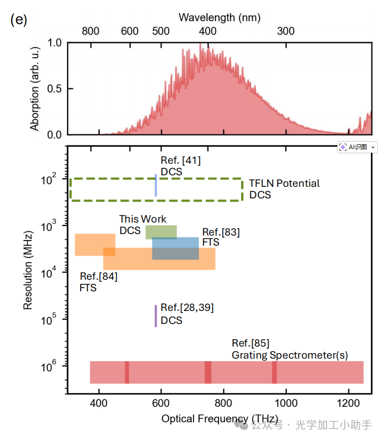 在补充图8(e)中,我们绘制了应用于测量二氧化氮的不同光谱技术的带宽和分辨率28, 41, 83–85。为了表明这一光谱区域内分子吸收带的典型范围,展示了使用光栅光谱仪在分辨率约为几百GHz的情况下测得的NO2 UV-VIS吸收带85。我们的系统测量了该分子中最高分辨率的光谱之一,但其带宽仍低于傅里叶变换光谱(FTS)所达到的带宽。为做比较,靠近我们工作的虚线框表示了TFLN波导所产生的完整带宽,具有梳模分辨率(100 MHz)。其他方法,如在高带隙材料中生成少周期脉冲的谐波生成,可能为350 nm以下波长的宽带覆盖提供途径86。