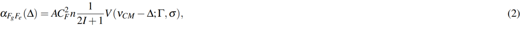 其中,CF² 是相对跃迁强度,n 是同位素的相对丰度,I 是同位素基态的简并度,∆ 是跃迁的相对频率,A 是在每次测量中所有跃迁共享的任意尺度因子。每条线的透射光谱是每个超精细跃迁的叠加,即: