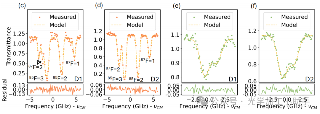 宽带双梳光谱,覆盖 (a) 原子铷和 (b) 原子钠。插图显示了测量到的跃迁的放大图。 (c)-(d) 测量的铷D1和D2跃迁,经倒谱分析(橙色)与模型(黄色)比较。跃迁标签表示相应的基态超精细状态和同位素。残差(测量值-模型值)显示在底部面板。对于D1跃迁,νCM = 377,107.409 GHz,对于D2跃迁,νCM = 384,230.436 GHz。D1和D2跃迁在两个不同温度下测量,详细信息见补充材料。 (e)-(f) 测量的钠D1和D2跃迁,经倒谱分析(绿色)与模型(黄色)比较。残差(模型-测量值)显示在底部面板。对于D1,νCM = 508,333.152 GHz,对于D2,νCM = 508,848.718 GHz。 结论与展望