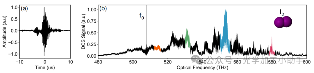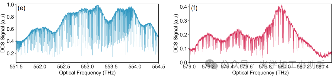 类似的分析也用于我们I2的双梳光谱。我们使用在双梳光谱低频边缘(约481 THz)无信号的1 THz带宽来计算标准差,近似噪声。然后,这个标准差被用来估算我们双梳光谱的SNR。我们估算的双梳带宽是SNR大于1的带宽范围。对于所呈现的碘实验,DCS带宽大约为120 THz。