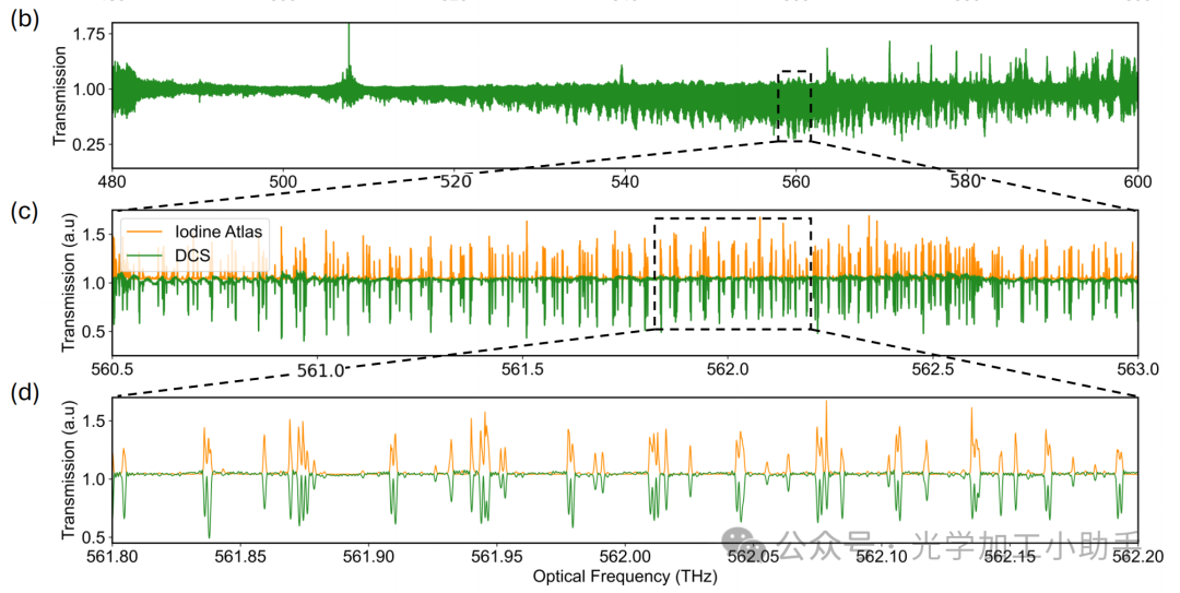 为了与现有的碘透射数据进行比较,我们使用倒谱分析推测我们的双梳光谱测量的背景强度光谱,如图3(a)中的蓝色所示65。去除背景后得到的透射光谱显示在图3(b)中。透射率显著大于1的区域对应于双梳光谱中没有测量到信号的区域,因此可以忽略。图3(c)中显示了一个区域,并将其与该光谱区域的宽带碘光谱图进行比较,光谱图的分辨率大约为600 MHz51。图3(d)提供了这一比较的扩展区域。将我们的数据中心100 THz(从≈490-590 THz)与碘光谱图在同一区域进行交叉相关,结果显示在光谱图的不确定度(90 MHz)范围内一致。