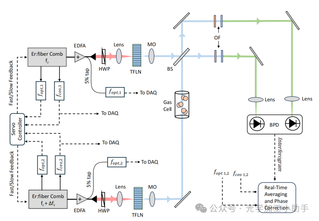 两个频率梳通过环外光学拍频检测和f-2f干涉法进行锁定。fceo信号的副本被发送到数据采集系统(DAQ)。通过在放大器中进行5%的取样,获得第二个光学拍频信号,并将其发送到DAQ。 EDFA:掺铒光纤放大器,HWP:半波板,TFLN:薄膜铌酸锂,MO:显微镜物镜,BS:分束器,OF:光学滤光片,BPD:平衡光电探测器。