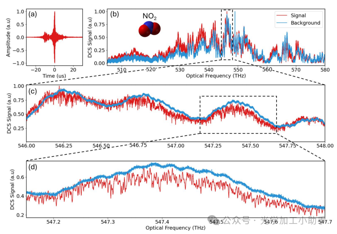 其中,T 是温度(以开尔文为单位),p 是压强(以托为单位)。对于我们在 T = 429 K 下的实验,钠在气体池中的蒸气压约为 11.2 µTorr。 图8. 二氧化氮光谱学的双梳干涉图与光谱 (a) 时间平均干涉图。 (b) 相应的双梳光谱(红色)和测量的背景双梳光谱(蓝色)。 (c) (b)中区域的放大图。 (d) (c)中区域的放大图,显示了二氧化氮的高密度吸收特征。 (e) 比较不同光谱仪器在测量二氧化氮时提供的光谱分辨率和带宽。顶部面板显示了NO2的UV-VIS吸收光谱作为参考。绿色虚线框表示我们的频率梳覆盖的完整带宽。