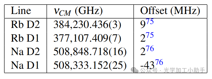 钠的D2和D1模型使用与铷相同的公式,但使用文献80中的相应数值。 包括与其他绝对频率测量的比较。偏移量定义为我们测量值与文献中值之间的差异,正值意味着我们当前的测量频率高于文献中的值。 我们独立地将每个四个模型拟合到我们数据的约10 GHz光谱范围内。这样可以避免低频波动(由于法布里-珀罗效应)显著影响拟合统计数据。每个模型有三个自由参数:幅度尺度因子 A、质心频率 νCM,以及一个垂直偏移量,用于补偿不完美的背景水平。通过这个拟合,我们推导出每条线的质心频率及其相应的统计不确定性。这些结果已报告在表1中。 我们通过频率梳每个梳齿的重复频率统计不确定性来估算光谱仪的频率不确定性。频率梳方程 δ fn = nδ fr + δ f0 告诉我们,重复频率 fr 和载波包络偏移 f0 的不确定性如何限制某个特定光学梳齿 fn 的频率知识。每个重复频率在测量过程中通过计数器进行测量,且不确定性通过Allan偏差进行估算。所有频率梳的频率和数据采集均参考GPS引导的振荡器,该振荡器的分数不确定性低于 1×10⁻¹¹。对于我们的光学稳定和自引用的频率梳,f0 的不确定性是加性且可以忽略不计。光学稳定性提供了优异的短期稳定性,因此,fr 的方差在大约1分钟以下的平均值中主要由参考振荡器主导。对于本文中进行的较长时间平均,δ fr 主要由腔体漂移主导。对于我们在约550 THz附近操作 2 小时的光谱仪,如在碘的测量中,我们估算频率不确定性为 10 kHz。 1.2.2 气体池与光谱学