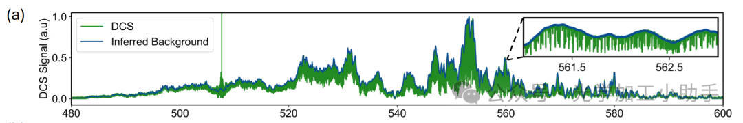 补充图8(a)显示了通过大约2.5小时的相干平均得到的时间域干涉图。相应的双梳光谱显示在补充图8(b)中,并与将二氧化氮从气体池中抽出后得到的背景光谱一起显示。显而易见的是,双梳光谱在2.5小时内发生了变化,因此背景光谱在许多区域低于信号光谱。这很可能是由于耦合进出TFLN波导的漂移(例如光机械漂移和振动以及波导缺乏温控)所导致的。
